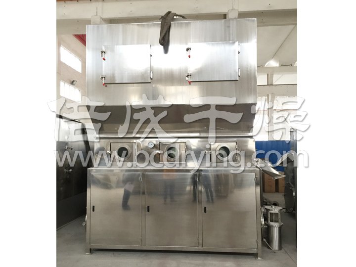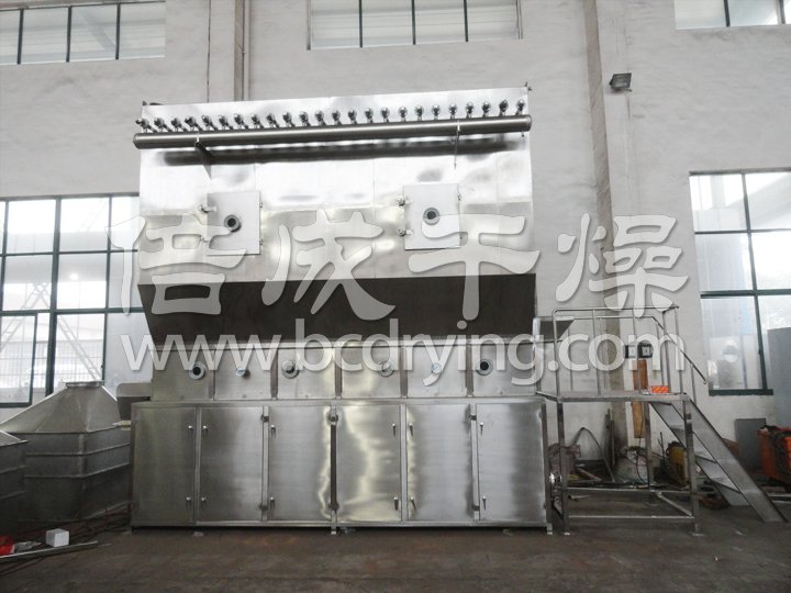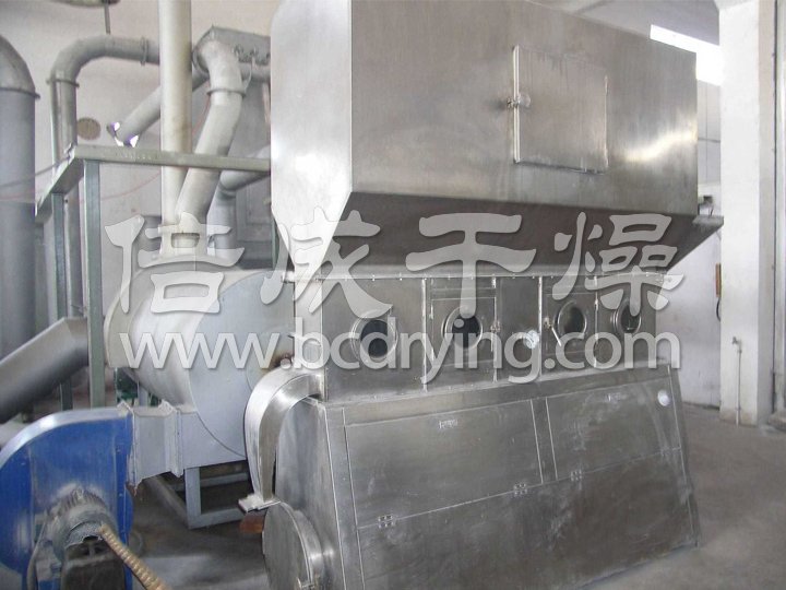 潔凈的熱風經閥板分配進入床體內,從加料器進入的濕物料被熱風形成沸騰狀態。由于熱風與物料廣泛接觸,增強了傳熱傳質的過程,因此在較短時間內就可干燥。如用連續型,物料從床體的一頭進入,經過幾十秒至幾分鐘沸騰干燥,自動從床體另一頭流出。本設備一般進行負壓操作。