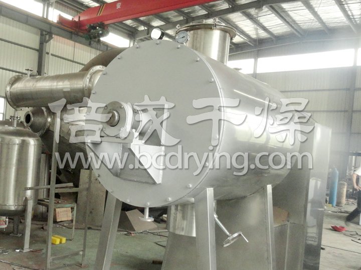 本機(jī)是一種新穎臥式間歇式真空干燥設(shè)備,濕物料經(jīng)傳導(dǎo)蒸發(fā),帶有刮板攪拌器不斷清除熱面上的物料,并在容器內(nèi)推移形成循環(huán)流,水份蒸發(fā)后由真空泵抽出。