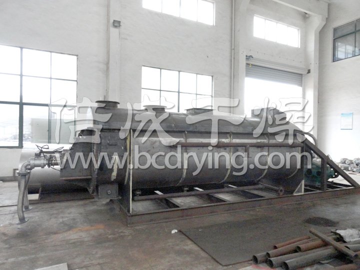 空心軸上密集排列著楔型中空漿葉,熱介質經空心軸流經漿葉。單位有效容積內傳熱面積很大,熱介質溫度從-40℃到320℃,可以是水蒸汽,也可以是液體型:如熱水、導熱油等。間接傳導加熱,沒有攜帶空氣帶走熱量,熱量均用來加熱物料。熱量損失僅為通過器體保溫層向環境的散熱。楔型漿葉傳熱面具有自清潔功能。物料顆粒與楔型面的相對運動產生洗刷作用,能夠洗刷掉楔型面上附著物料,使運轉中一直保持著清潔的傳熱面。漿葉干燥機的殼體為Ω型,殼體內一般安排二到四根空心攪拌軸。殼體有密封端蓋與上蓋,防止物料粉塵外泄而充分發揮作用。