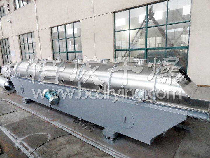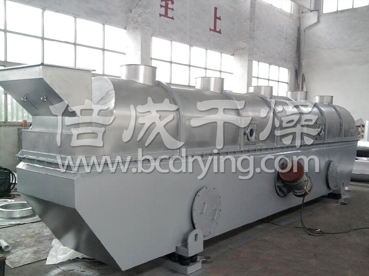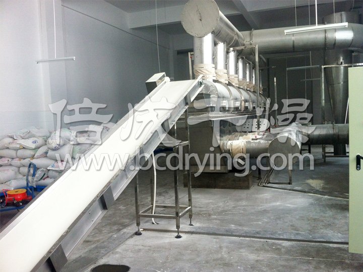 物料自進料進口進入機內,在振動力作用下,物料沿水平面流化床拋擲,向前連續運動,熱風向上穿過流化床同濕物料換熱后,濕空氣經旋風分離器除塵后由排風1:3排出.干燥物料由排料進口排出。