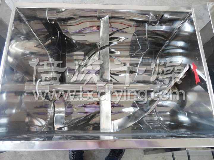 ◎本機與物料接觸處均采用不銹鋼制造,槳葉與桶身間隙小,混合無死角,攪料軸兩端設有密封裝置,能防止物料外瀉。