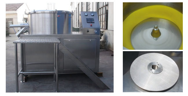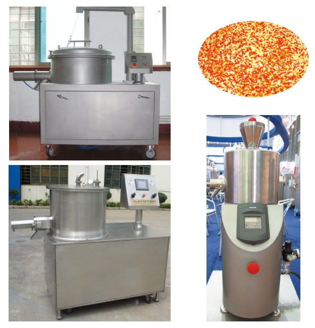 本機是通過設置旋轉離心盤、鼓風機、氣動噴槍,將濕顆粒制成美麗的球丸。將前道工序做成的濕顆粒投入旋轉離心盤內,啟動鼓風機后再將旋轉離心盤啟動,使濕顆粒受到環隙空氣浮力、旋轉離心力、自身重力作用,呈環周繩股狀運動,從而形成真球度極高的球丸。旋轉盤自動升降,使物料的收集和制丸速度大大提高。
